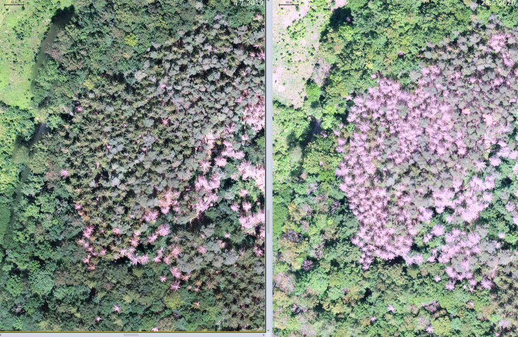 The dying of the spruce trees is not surprising but other areas show less changes in May (compared to July 5th) but we clearly have to evaluate the situation again end of June / beginning of July.