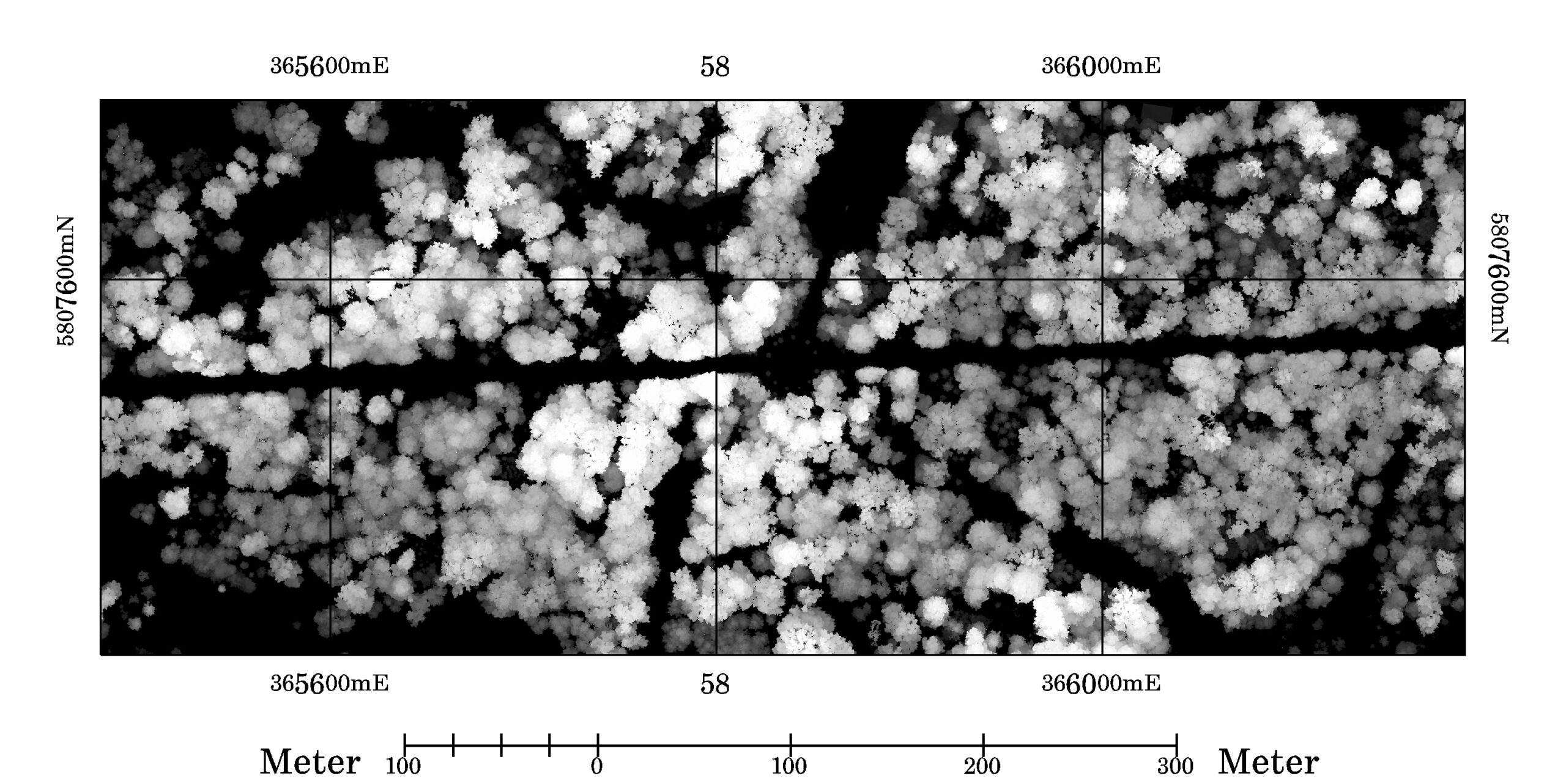 Leaf-off data sets were processed in DJI Terra to generate LAZ-format point clouds (100% density, with “optimize accuracy” and no smoothing). The point cloud files were then used to calculate canopy height models (CHMs) in both point cloud (LAZ) and raster formats, and deriving multiple height slices from BHD to top of canopy.