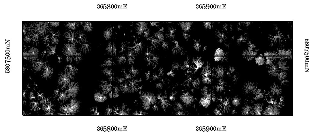 Fig.3: Subset from Fig 2. L2 Leaf-off CHM point cloud based raster visualization (1.37 – 40m height) point density in voxel space mapped to 20cm voxels columns. WGS84 UTM33 projected, park Sanssouci in march 2026.