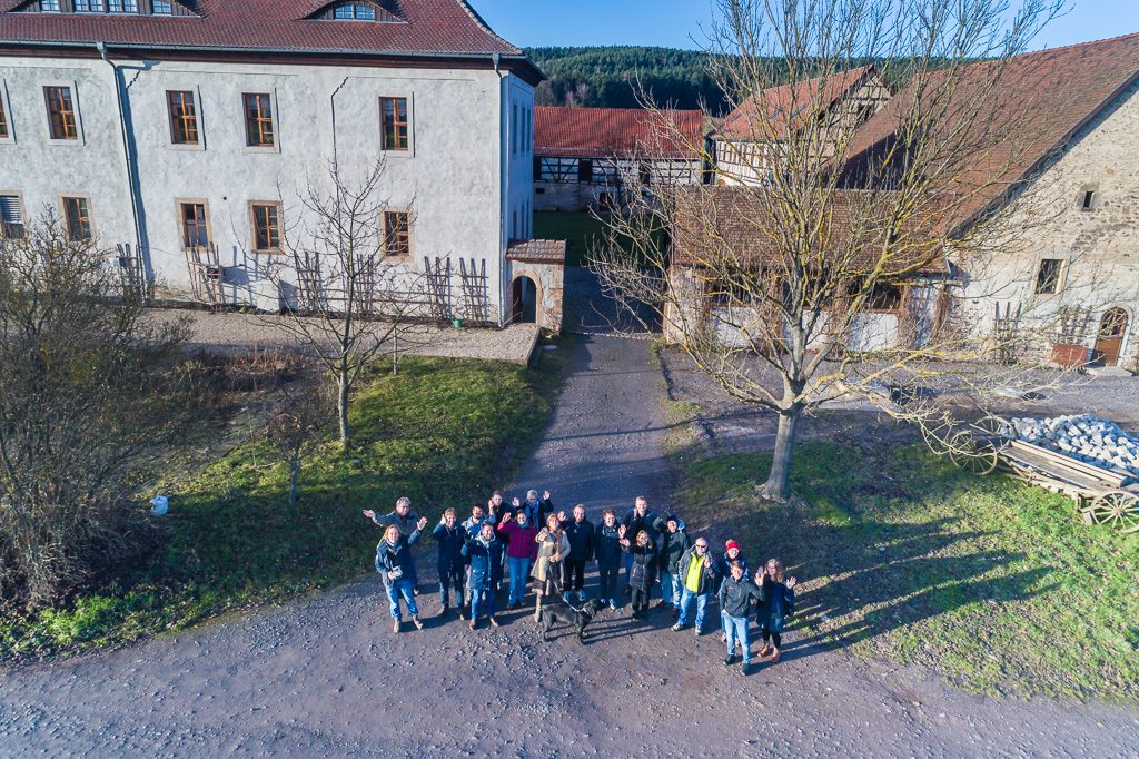 Struktur Retreat des Lehrstuhls für Fernerkundung im Rittergut Positz (10.-11.1.2018). 2 lange Tage mit Präsentationen, Diskussionen, viel Planungen für 2018, Gruppenbild vom Copter ;).